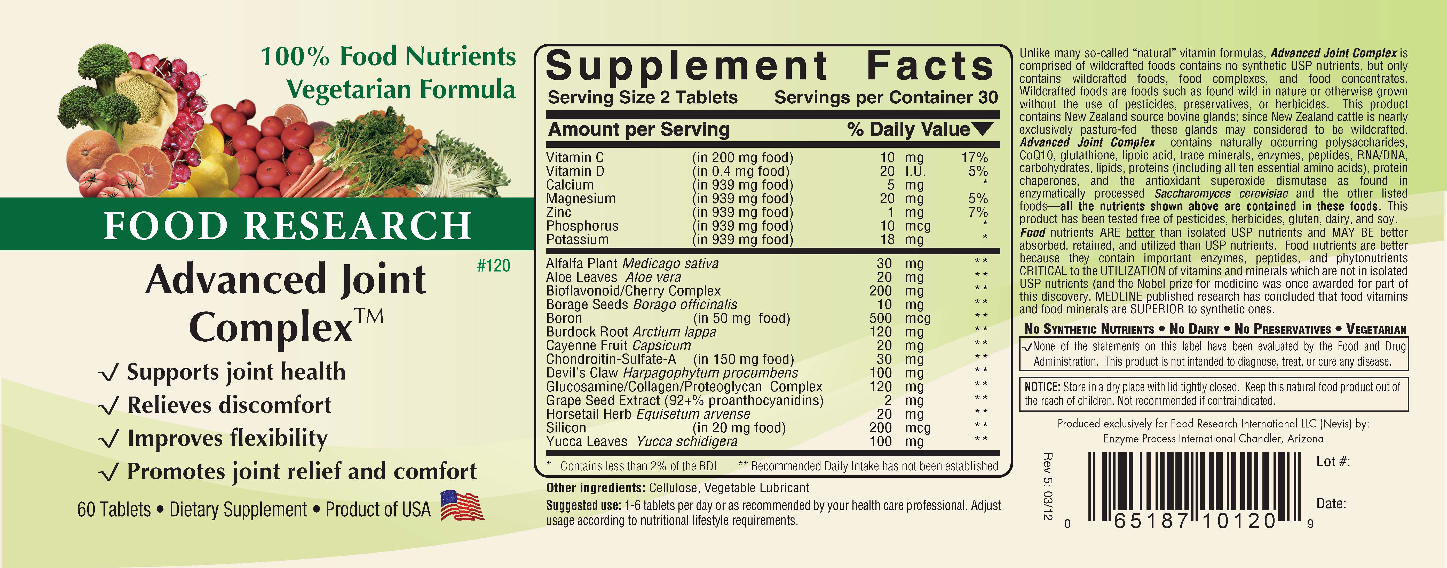 Description: Advanced Joint Complex from Doctors’ Research Inc. is a 100 percent food supplement intended to supply nutrients, glandulars, and herbs needed to maintain optimal joint health. Bovine tracheal tissue naturally supplies chondrocytes including glucosamine and chondroitin. Herbs, like devil’s claw, have long been used to support joint health.