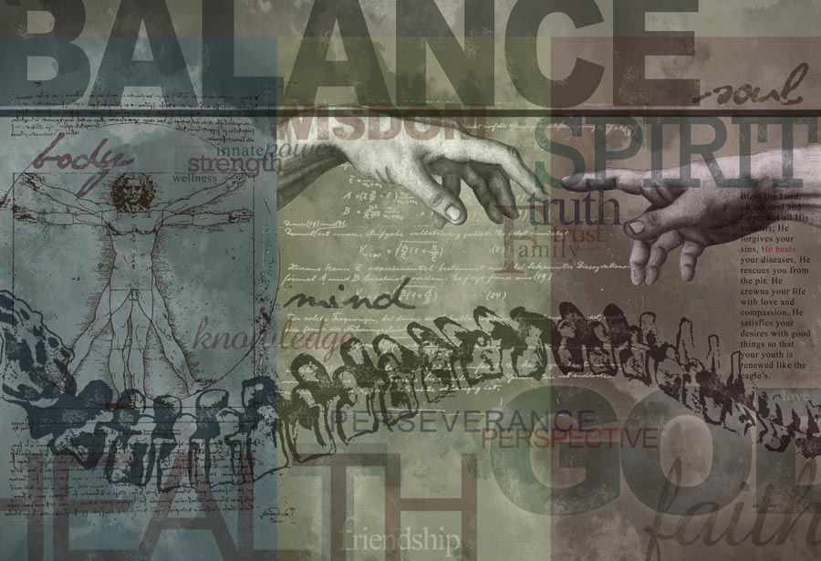 Description: “Balance” is a three-piece set from Clinic Artwork. It is about the body, mind, and soul all being connected, and how our thoughts, feelings, beliefs, and relationships all play a part in our overall health. Since the spine holds our physical bodies together, a lateral view of the spine runs through the three-piece print. Each print stands alone as a piece of art, yet as a group they form something even more beautiful. Together, they spell balance, which is your ultimate goal. Images and quotes from the last 2,000 years that represent creation, humanity, and faith are present within this mural.