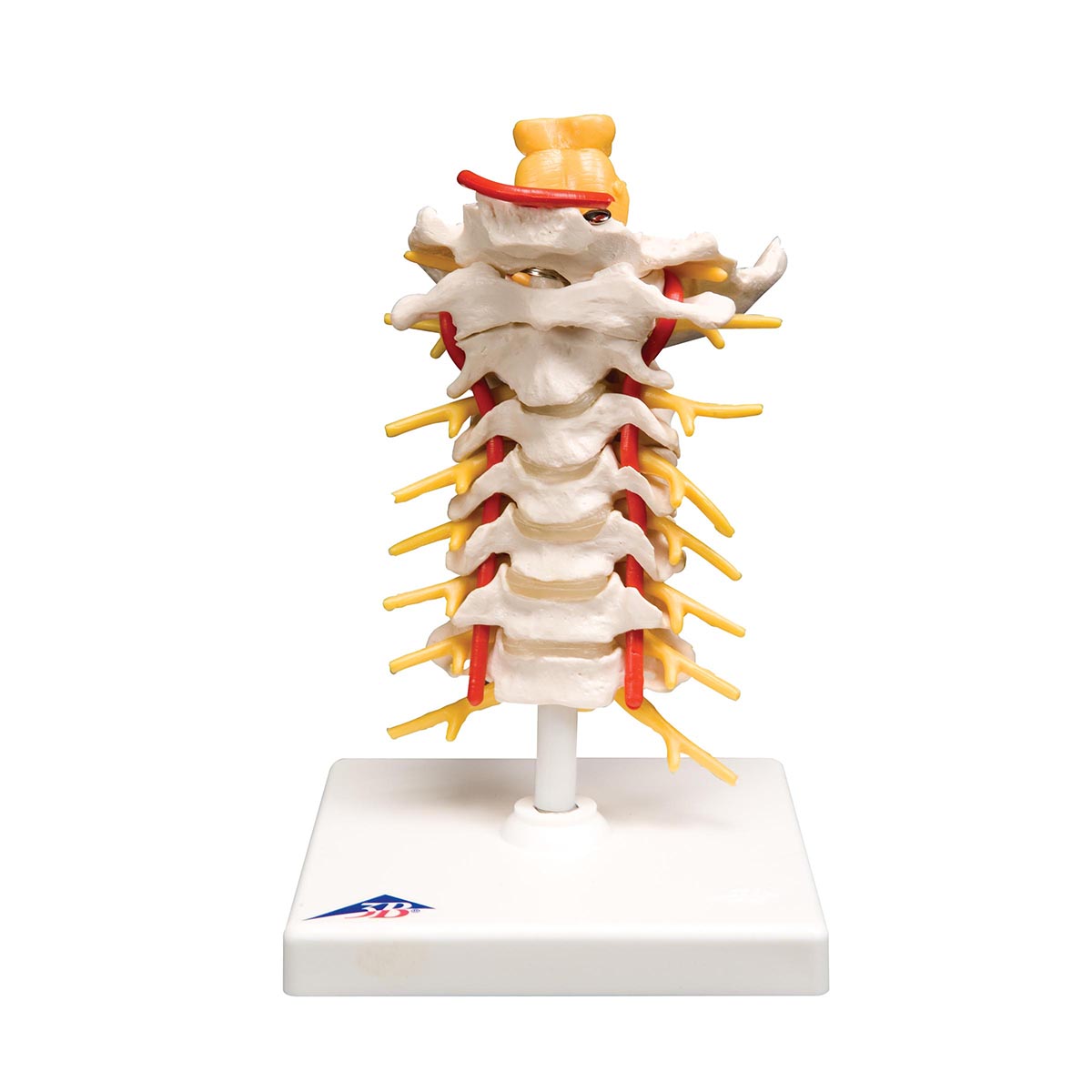 Description: Cervical Spinal Column from American 3B Scientific is a real life replica of the anatomy of the cervical spinal column. It consists of the occipital plate, the seven cervical vertebrae with intervertebral discs, cervical nerves, vertebral arteries, and spinal cord. The cervical spinal column comes with a flexible stand.