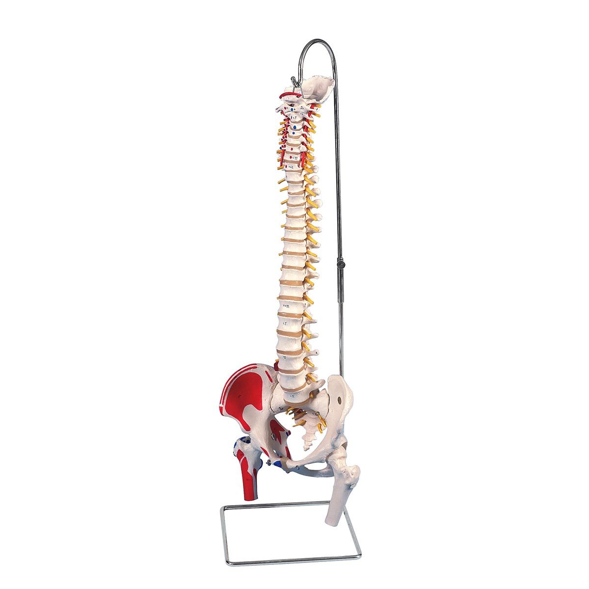 Description: Classic Flexible Spine with Femur heads and Painted Muscles from American 3B Scientific features painted spines add a new dimension to demonstrations. Muscle origins (red) and insertions (blue) are painted on left innominate, femur, and vertebrae of spine.