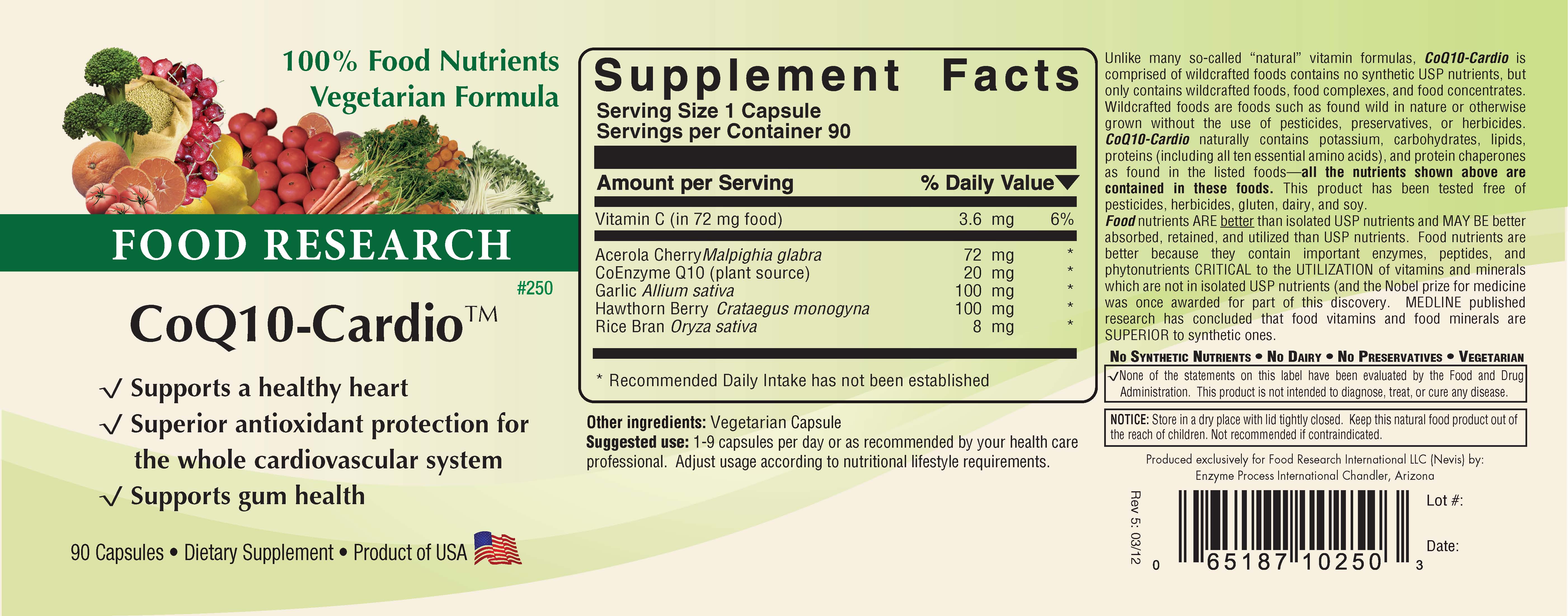 Description: Co-Q10 Cardio from Doctors’ Research Inc. is a 100 percent vegan food supplement intended to supply nutrients needed to maintain optimal and support cardio-muscle health. Co-Q10 Cardio supplies plant-source co-enzyme Q10, a nutrient that is important for healthy cardiovascular system function, along with other herbs.