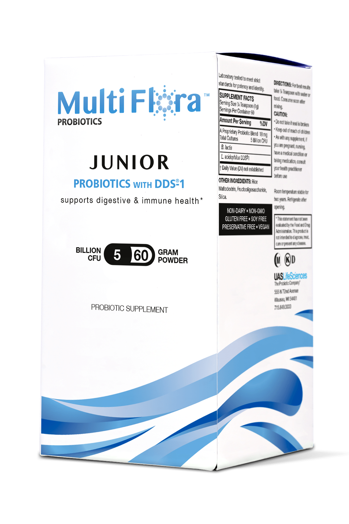 Multi-Flora Junior is formulated with a higher percentage of bifidobacteria to be compatible with a younger gut flora and includes Bifidobacteria lactis and the superstrain, L. acidophilus DDS®-1.