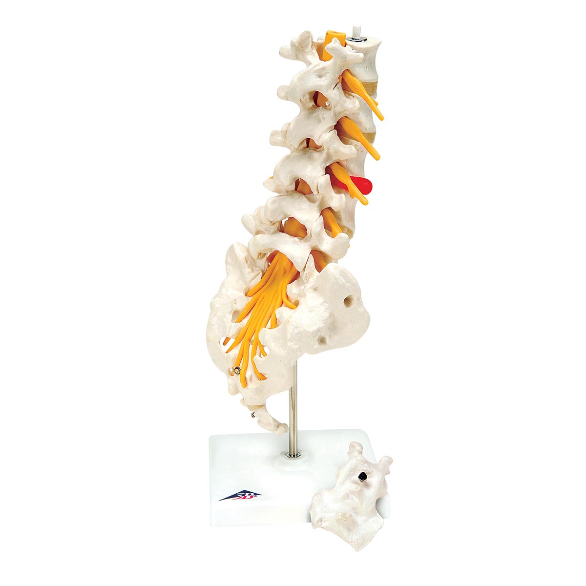 Description: Lumbar Spinal Column with Dorso-lateral Prolapsed Intervertebral Disc from American 3B Scientific includes a prolapsed inter-vertebral disc between the 3rd and 4th lumbar vertebrae. This high quality anatomical model of the lumbar spinal column is delivered on removable stand.