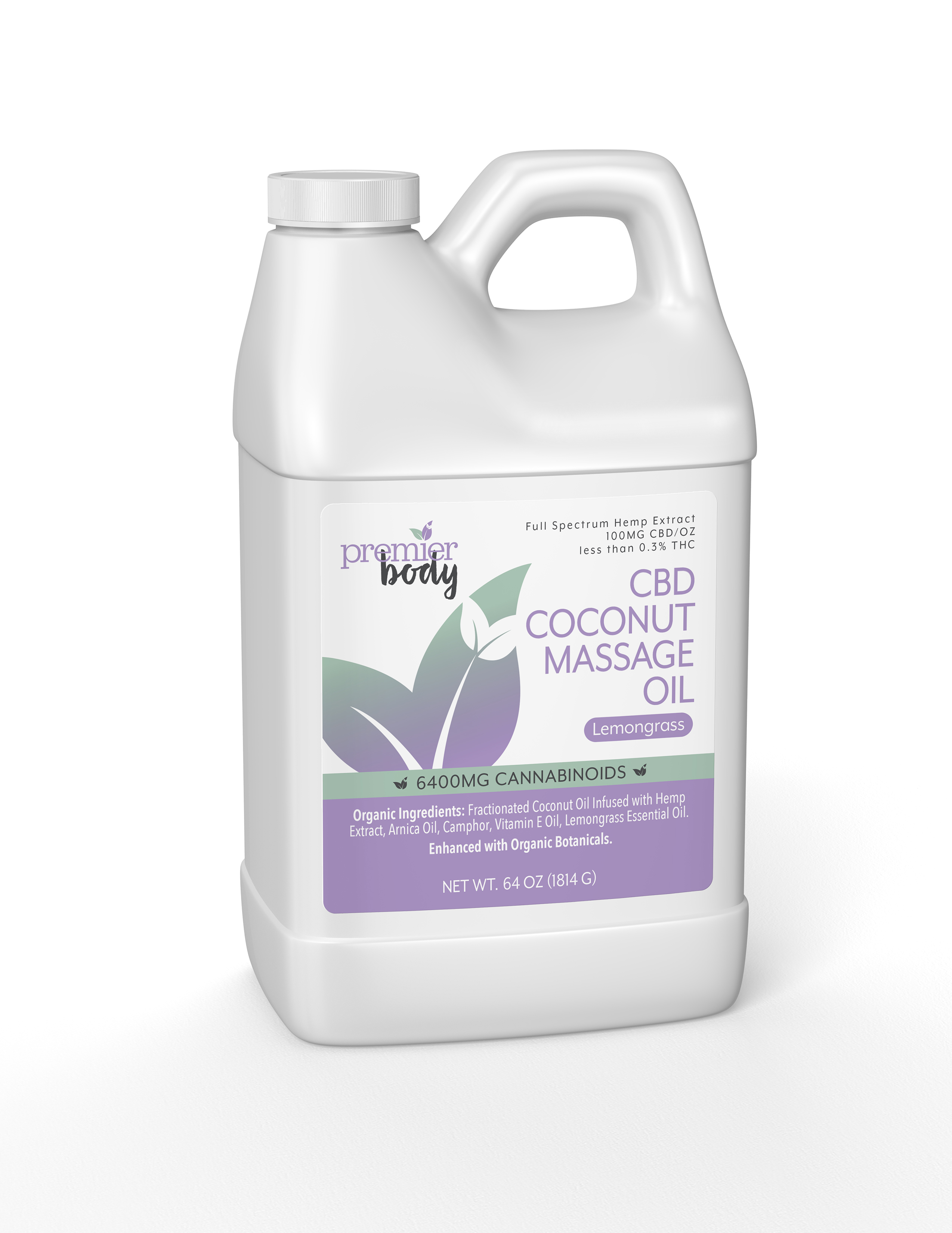 Premier Body – DOUBLE STRENGTH 64 oz Coconut Massage Oil with Lemongrass – 6400mg CBD with THC – CLICK HERE TO ORDER