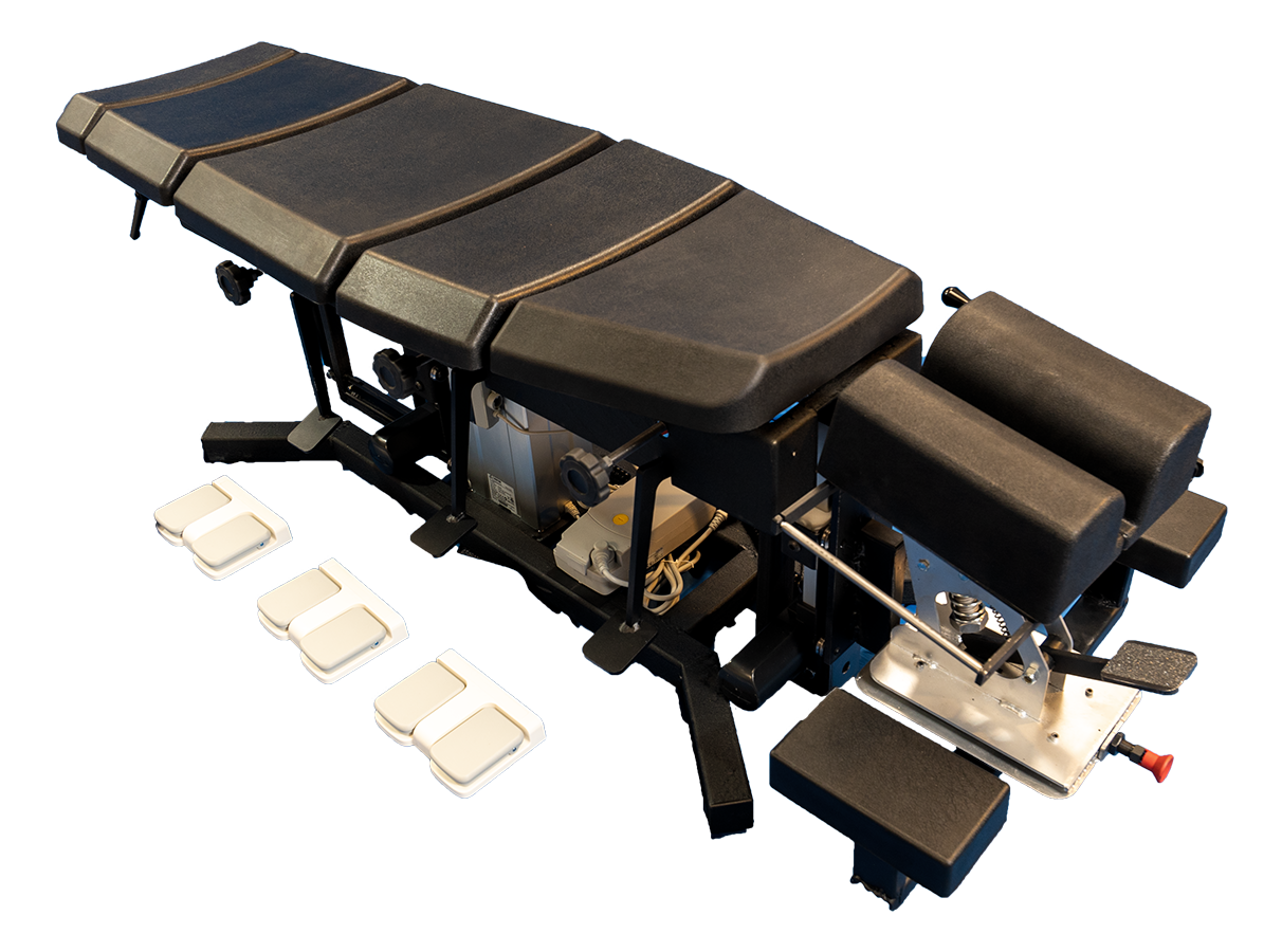Multi-dimensional HAMMER TOGGLE headpiece with linear bearing slides for smooth translation. This is the most significant advance in drop table technology since the introduction of the segmental drop table by Doctor J. Clay Thompson in 1957.The Hammer Toggle allows the doctor to neutralize all combinations of cervical and upper thoracic spinal distortion prior to delivering the adjustive correction.