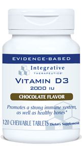 Description: Vitamin D3 2,000 IU Chocolate Chewable from Integrative therapeutics provides an easy way to increase intake of cholecalciferol — the same form of vitamin D our bodies create naturally. This chocolate chewable tablet means that taking this supplement is easy to remember. Human skin cells can synthesize adequate vitamin D after exposure to UV-B rays from sunlight, which is why it is sometimes called the “sunshine vitamin.†However, many people fail to maintain adequate vitamin D intake. Integrative Therapeutics offers three vitamin D3 supplements — 1,000 IU tablets and 2,000 IU or 5,000 IU chocolate flavored chewable tablets. These dietary supplements utilize the natural form of cholecalciferol (D3).